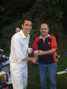 Today’s 2010 Allstars Festival was a huge success, enjoyed by all. We played a two x 15 over innings per side game, with the batting order reversed in the second innings, which meant that everyone got to participate. In the end, “Young Boys of Barnes” captained by Gren, beat Devers’ eponymous team by 24 runs. The picture shows Maxie presenting the match ball to the victorious captain — with defeated captain Devers in the background.