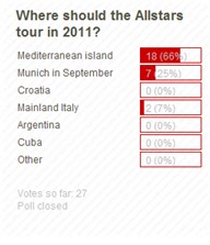 To the surprise of no-one, “Mediterranean island” has won the poll to select the destination for the Allstars’ 2011 tour. It was the runaway winner, with 66% of the votes.