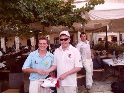 The presentations After each match we presented the opposition captain with a signed miniature bat and tour shirt, as tokens of our appreciation. Our representatives, James A and Tarka, also made a speech. Unfortunately, neither of the Greek captains could speak English, and their baffled facial expressions suggested they had no idea what on earth we were doing or talking about. On Saturday, Tarka poured a water bottle over Garreth’s head during the shirt-swap. The Corfu skipper presumably thought this was part of the ceremony – rather like a baptism.