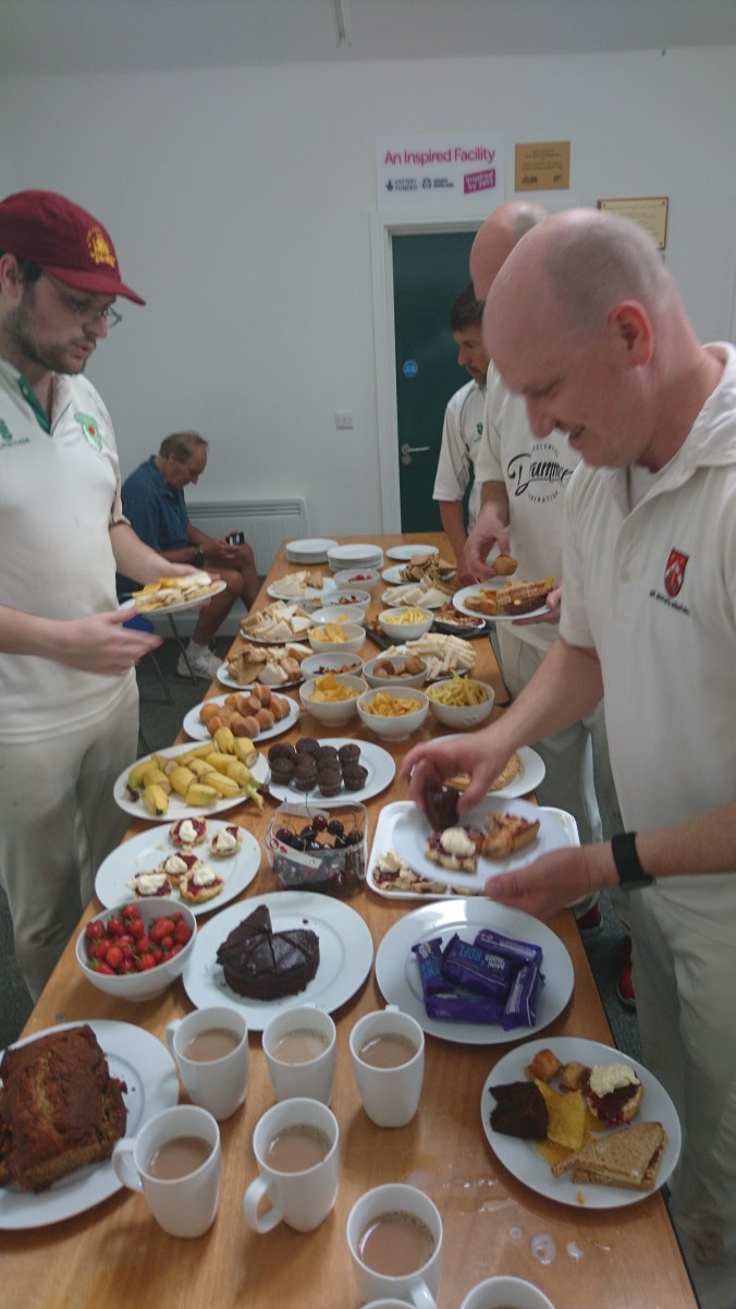 Matfield treated us to a fabulous tea, their scones and cream and hot sausage rolls standing out amidst an excellent spread. It was a team effort – though one of their number got some serious stick from his team mates for the lamest excuse ever for failing to help out with making tea, claiming as a left-hander he “couldn’t butter with a right-handed knife”. Suitably refreshed, we set about the chase. Openers Pete and Chris started cautiously against the excellent “Spees” – as the oppo told us he likes to pronounce it – and Craig Butfoy, as just 16 came off the first 6 overs. The score then doubled in the following over as Chris went on the attack, hitting Butfoy for two monster sixes down the ground. Both openers then went in quick succession, Pete run out going for a sharp single and Chris caught behind off Spies, to leave us 43-2 after 11 overs.