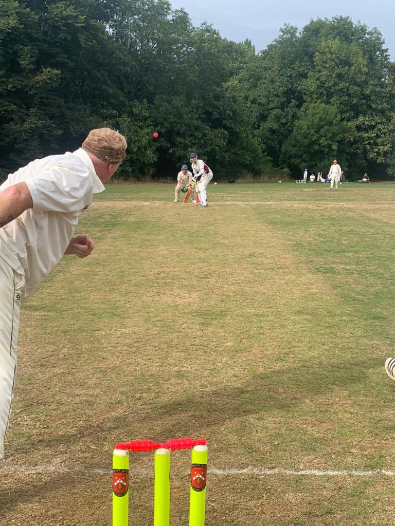 This was to bring together the partnership of the day as the two Matts, Biss and Lo, continued their fine form from the previous week. Matt Biss belied his own self-declared reputation as a nudger and nurdler as he unleashed some fine shots and Matt Lo played the shot of the day, a sumptuous six off left-arm spinner Ryan. It was perhaps not the day to be looking for the ball in the undergrowth, as always seems to be the case at Barnes Common – though we were fortunate that lost time was our only problem, as it was subsequently reported by the BBC that a 5ft boa constrictor was captured that day, less than a mile from the ground.