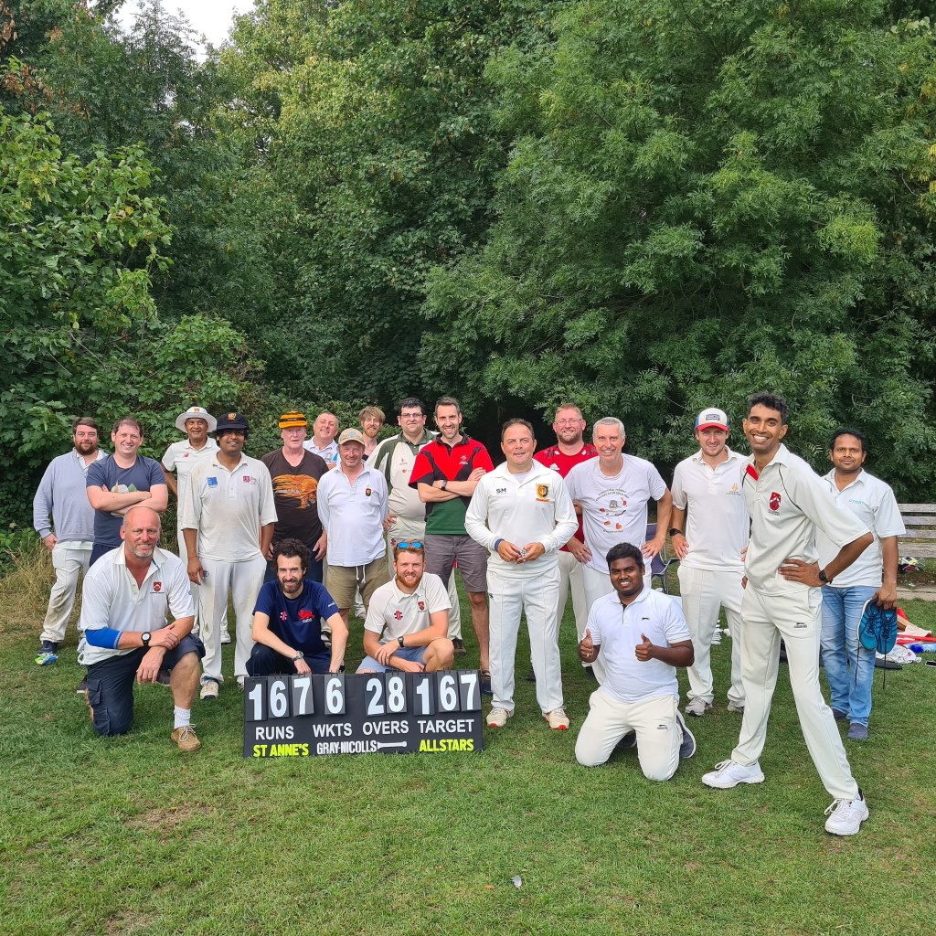Barnes Common, Sunday 16 August 2020. St Anne’s Allstars 167-6 (28.5 overs: Matt Lo 56, Matt Biss 51) beat Zambuca Tigers 166-8 (35 overs: Samer Hafiz 3-19) by 4 wickets.