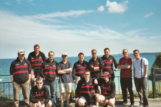 With the Atlantic ocean behind us, resplendent in our new tour rugby shirts. This was taken in front of our wonderful hotel. This charming hostelry is perfect for any holiday makers, from young families to stag groups and retired couples. Perfect, that is, if you enjoy mouldy ceilings, rude staff, fire hazards, bed linen full of cigarette burns, and lavatories without either locks or soap.