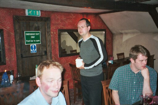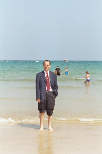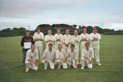 We finally got round to some cricket later in the afternoon, and here we are in the field against Seaview CC in Penryn. They were a very nice bunch of chaps, and decent players too, surviving Adam’s brilliant hat-trick – remarkably, the second of the 2002 season, following Paul Nicol’s on his Allstars debut against Rain Men – to post an impressive 19 over score of 165-7. Note my panther-like stance at mid-off.