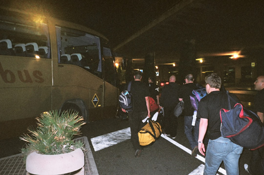Most of us made an uneventful journey to the airport by train, apart from Garreth, that most natural of motorists, who decided to enliven proceedings by having his car break down on the way to Gatwick. You will notice that we are all wearing our Allstars tour t-shirts. These did not arrive from the screen-printers quite as envisaged. My idea was to stylishly combine the club colours by having a discreet red pinstripe run down the right side of the black shirt, in a way similar to the England 2002 football World Cup strip. This was rather lost in translation, and what we actually got was a fat scarlet oblong, which started somewhere around the nipple and ended above the waist. The effect produced was to make it seem as if we were all wearing our squad numbers, but each of us was number 1.