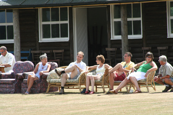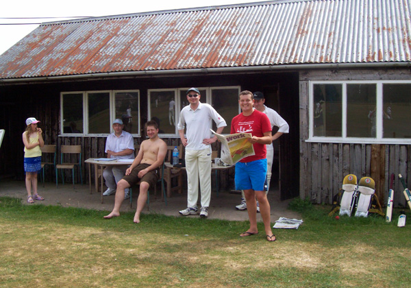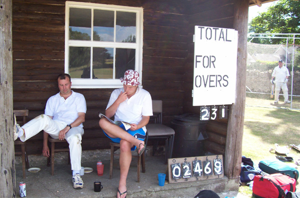 Dave and Roger, elected joint captains for the day, promptly lost the toss and condemned us to field first on another scorching day. We once again got off to a good start, though, as Tristan and Chadders took a wicket each. But Rock are a proper league cricket side with some quality batsmen, and with the last two nights catching up with us, left-hander David Gray (one of four with that surname in the Rock side) and right-hander Tom Parkinson (a dead ringer for Paul Collingwood) put our attack to the sword. Parkinson was particularly ruthless against Devers and me as he raced to a hundred before being retired by his skipper. Following one massive six out of the ground, he helpfully assisted our search for the ball by telling us “it’s in the wood near the tree”.