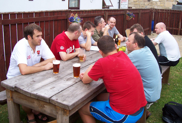 In the beer garden, and at dinner, at the Tankerville Arms.