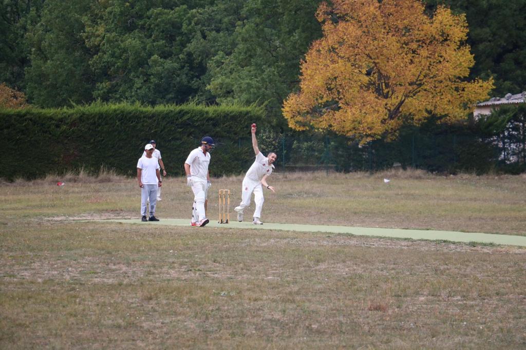 It was Gren Thompson who struck first, removing Riviera skipper Kaleem without scoring. It was an odd choice to shoulder arms to a yorker on middle stump, but you can write your own joke about the French easily surrendering here. The broad-shouldered Ben D came to the wicket and runs began to flow quickly as his power paired with Ninad’s grace like a Provence rosé paired with a smooth, rich cheese.
