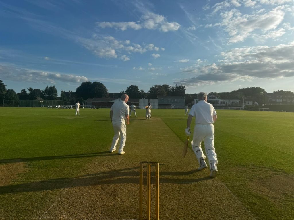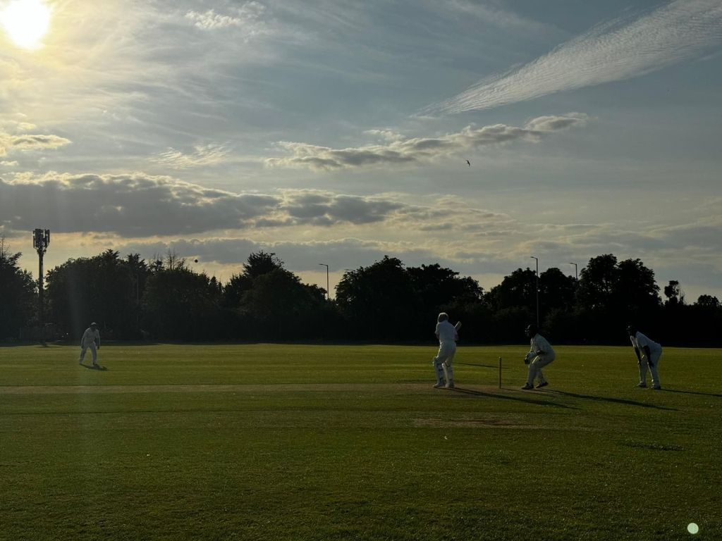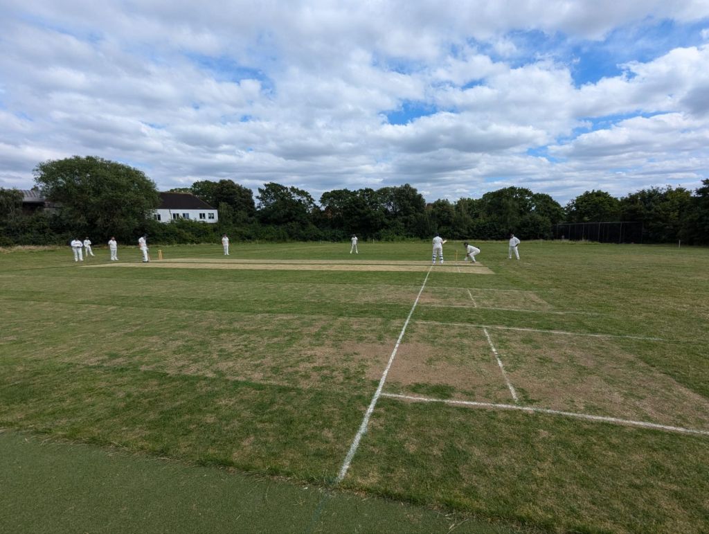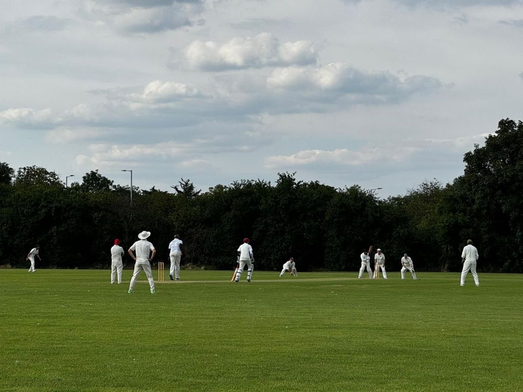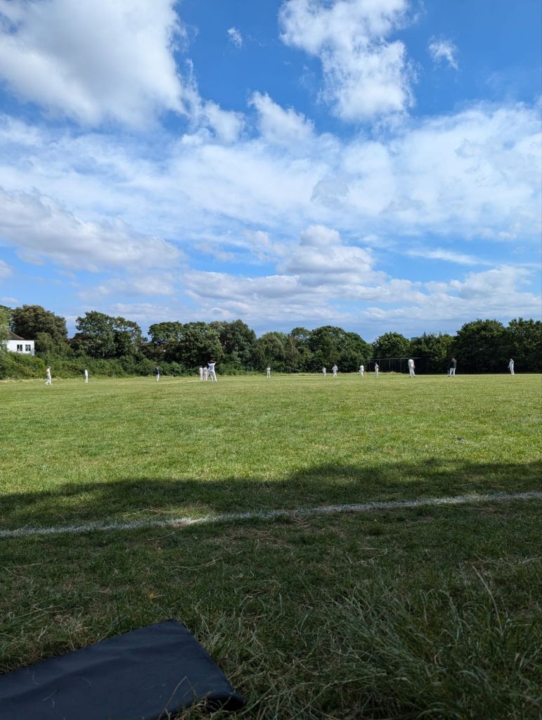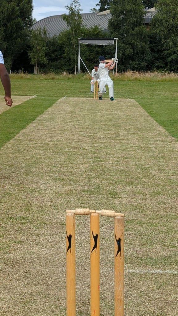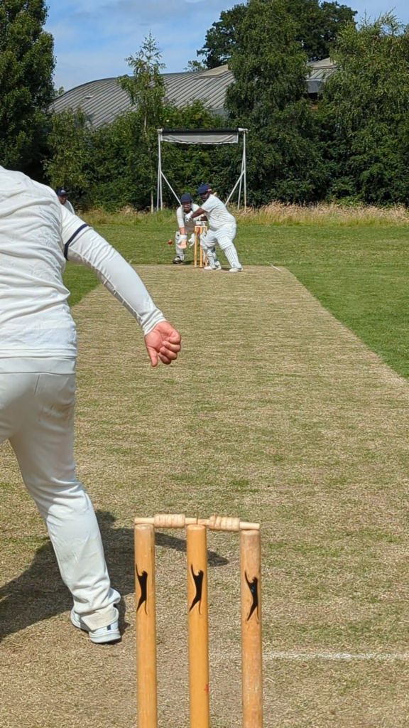 The triple blow brought the tall Akshay Prasad to the wicket, and together with Hugh Evans, he repaired the early damage. They’d doubled the score by the drinks break – but as so often, the resumption brought a wicket, as Evans tried to smash Phani Sainath out of the ground and was brilliantly caught by Alfie on the cow boundary. Keeper Holbrook joined Prasad, and they continued to up the tempo – Shahed bowling nicely, but also without any luck. Skipper Matt, incredibly putting his body through a third consecutive day’s cricket, finally got the break as brought himself on to bowl and castled Holbrook.