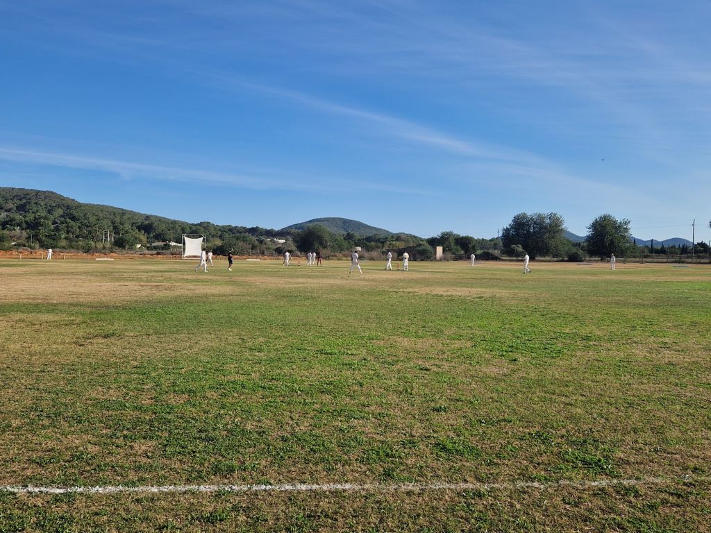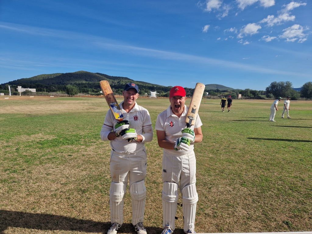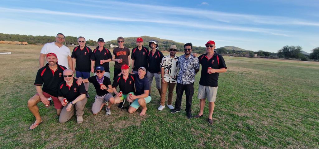 We were treated to the first helping of our hosts’ superb local cuisine – a great fish stew with beans – with the game seemingly almost won. But, just like the Americans in the Sunday singles, SWH refused to give in without a tremendous fight, as Steve and Vedrun put up stout resistance. After 12 overs, their stand was finally broken as Vedrun hit an excellent delivery from centurion Vivek to Roy at cover. Having pulled up injured after bowling just 3 deliveries in Ibiza, every ball Chadders bowled without breaking down was greeted with cheers, and it was him who finished the job as Steve feathered an edge to Matt before sportingly walking.